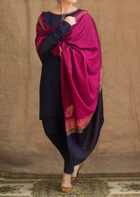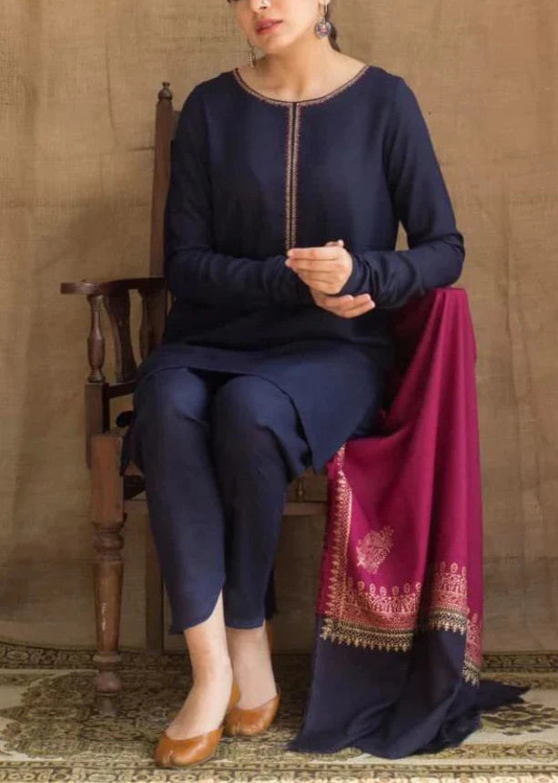 3PC Dhanak Neckline Embroidered Suit with Printed Wool Shawl (Unstitched)