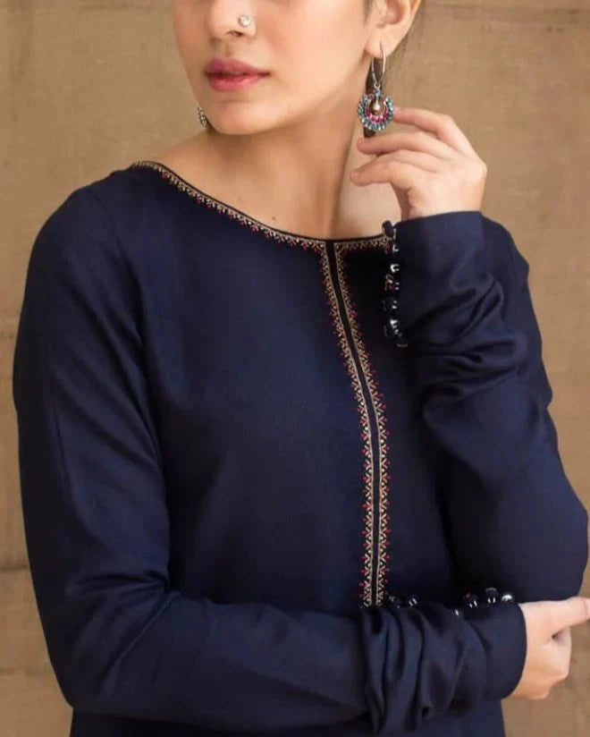 - Shirt: Plain Dhanak front with embroidered neckline patch + embroidered sleeves