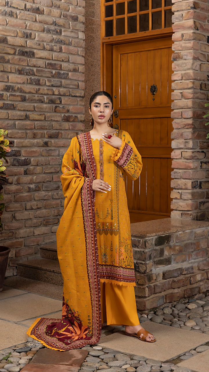 Elevate your winter wardrobe with the SALINA – Winter 3PC Khaddar Printed Shirt and Dupatta -  Plain Khaddar Trouser (Unstitched). Crafted from premium-quality khaddar, this 3-piece ensemble is designed for both comfort and elegance during the colder season. The all-over printed design adds a timeless charm, making it a versatile choice for casual and semi-formal wear.