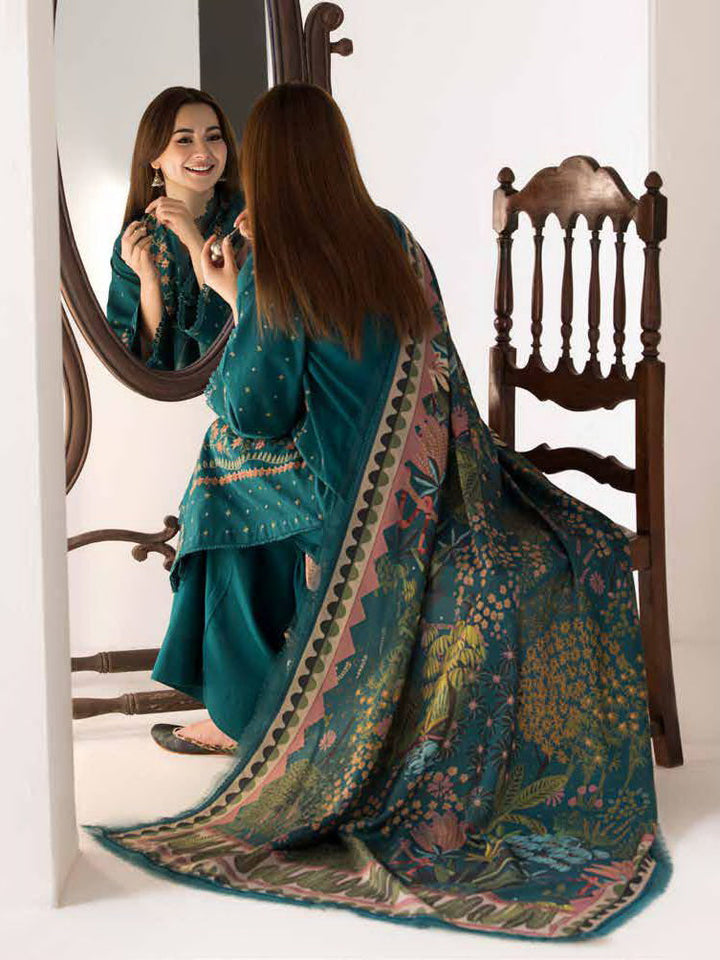 Elevate your winter style with this 3-piece embroidered Dhanak suit, crafted for elegance and comfort.